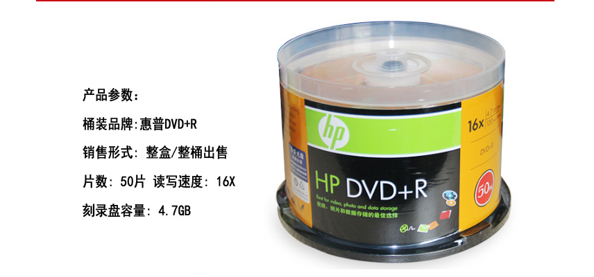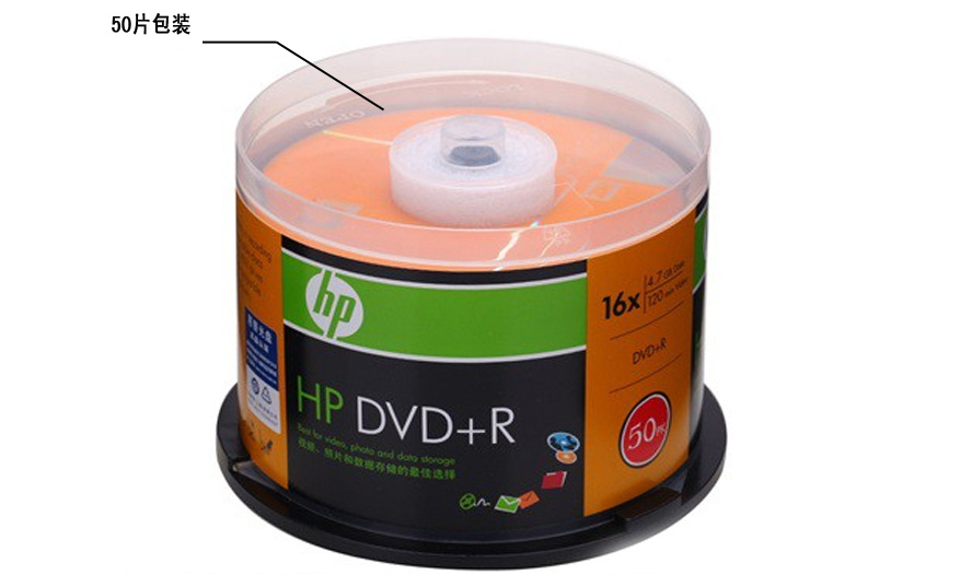商品名稱:惠普(HP) DVD+R 光盤/刻錄盤 空白光盤 16速4.7GB 桶裝50片