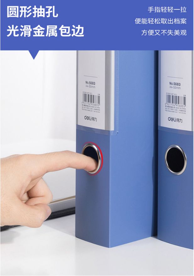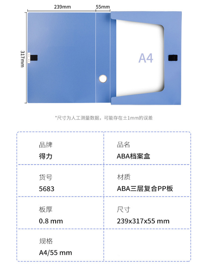 商品名稱(chēng):得力(deli)檔案盒A4塑料加厚文件盒辦公用品財(cái)務(wù)票據(jù)收納冊(cè) 得力(deli)中端款側(cè)寬55mm/5683單個(gè)裝
