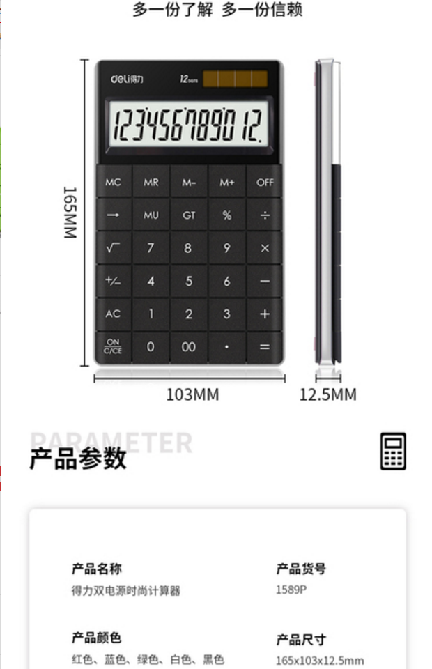 商品名稱:得力(deli)雙電源時(shí)尚計(jì)算器 輕薄機(jī)身平板按鍵桌面計(jì)算機(jī)辦公用品 得力(deli)計(jì)算器1589P