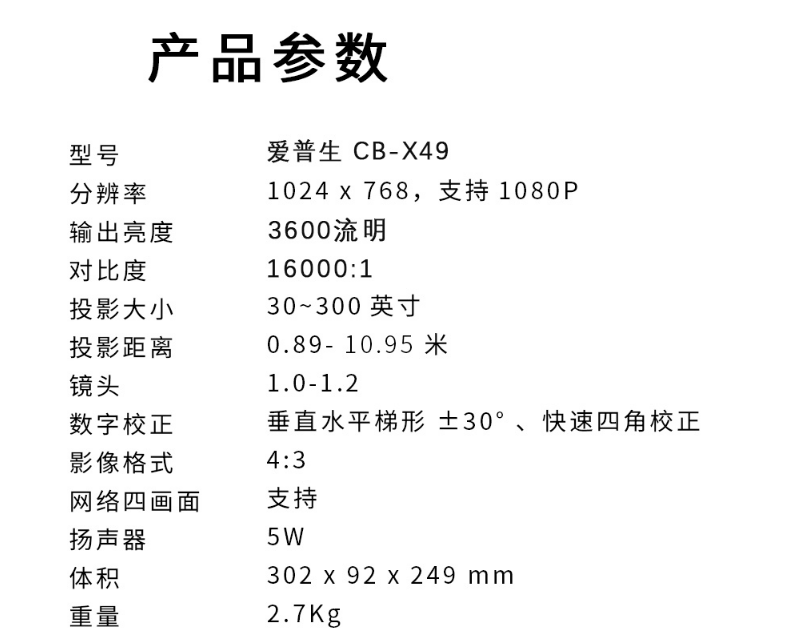 商品名稱:愛普生(EPSON)CB-X49 投影儀辦公掛式 投影機(jī) 商務(wù)投影儀 會(huì)議培訓(xùn) (含100英寸4:3電動(dòng)幕布 白色)愛普生CB-X49 投影儀