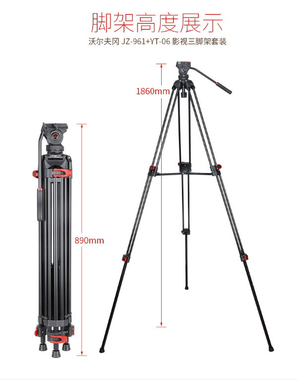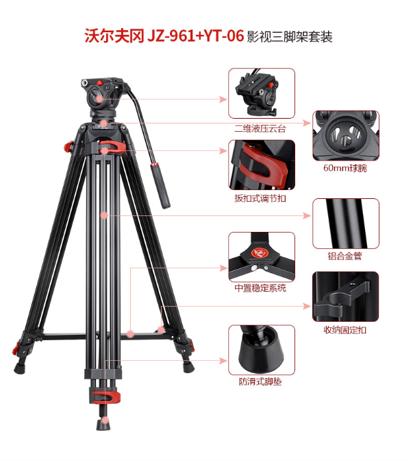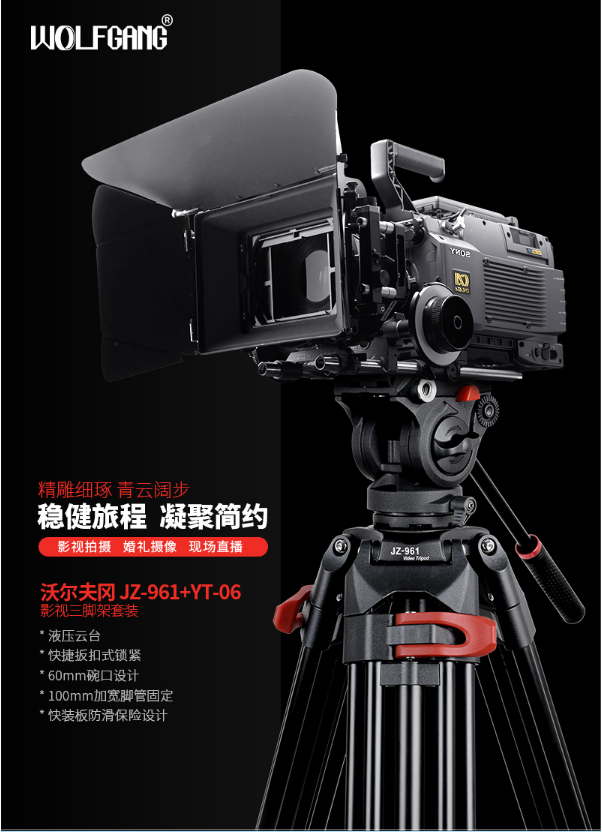 商品名稱(chēng):沃爾夫?qū)╓OLFGANG)JZ-961+YT-06 專(zhuān)業(yè)攝像機(jī)三腳架 二維液壓阻尼云臺(tái)支架 稱(chēng)重6KG 沃爾夫?qū)鵍Z-961